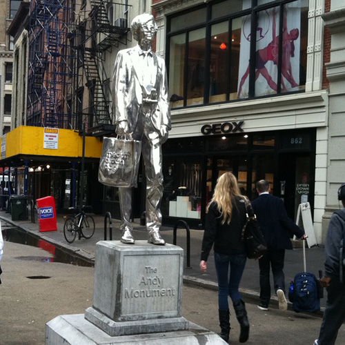 תראו מה קיבלנו משליחתנו בניו יורק (במקום טוברלרונים): פסל כרום גדול מימדים ומסנוור בדמותו של אנדי וורהול הוצב (לא לאורך זמן רב) ביוניון סקוור (על ברודווי ורח' 17 ווסט), ממש בסמוך לבניין בו שכן בשנות ה-70 וה-80 הסטודיו המפורסם של אמן הפופ – "הפקטורי". הפָסַל, ומעריץ אישי של וורהול, רוב פרואיט, מצרף בזאת עוד דמות אייקונית לשורת פסלים שכבר מוצבת באזור הכיכר – כמו אברהם לינקולן, ג'ורג' וושינטגון, מהטמה גנדי ואפילו מרים הבתולה (בקיצור – אם אתם כבר באזור – שלפו מצלמות). פרואיט אגב לא שכח לצייד את הפסל במצלמת פולארויד ושקית קניות מבלומינגדייל'ס (בה נהג וורהול לשאת את גיליונות המגזין שהוציא "אינטרוויו"). פייר? בניו יורק לא צריך הרבה מעבר לזה.