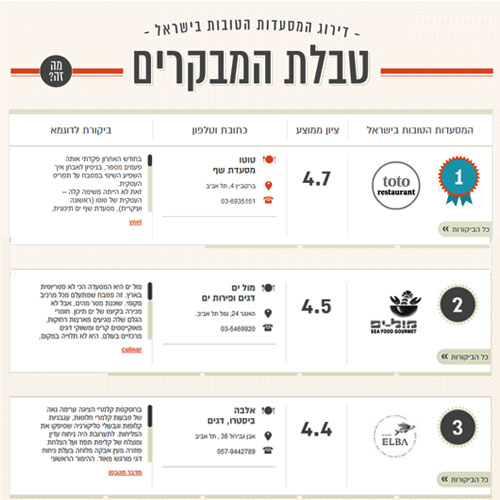 אין שאלה שיותר מעוררת דיון (שלא לומר, גוררת לשאגות) מאשר לזרוק לחלל המשרד "תגידו, איזה מסעדה הכי טובה לדעתכם?". אחרי שהשיחה מידרדרת להשמצות, אנחנו בולמים ומסכמים שעל טעם וריח אין מה להתווכח (ובתכל'ס, הכי יש על מה להתווכח ולראייה השעה האחרונה). איך שלא יהיה, כבר שנים אנחנו מתים שמישהו יעשה פה סדר, ישקלל את הנתונים החשובים באמת, יכניס לטבלת אקסל ויאיר לנו את הדרך.