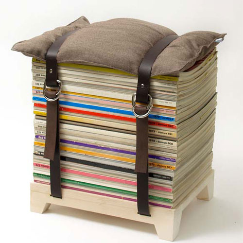 הסתכלו סביבכם בבית רגע: האם ערמת העיתונים בשירותים / בסלון / על האיילנד במטבח / ליד המיטה – מסרבת לקטון ורק מושכת יותר ויותר צומי? הנה פתרון נאה לעניין: הסטודיו הגרמני NJU מציע לערום את כל המגזינים או עיתוני סופהשבוע שאתם פשוט לא מסוגלים לזרוק (ע.ע. טורים של דורון רוזנבלום ומתכונים למרק מוקרם), להניחם על שרפרף עץ קטן ומקסים, בעל שתי רצועות עור שעוצבו ידנית וניתנות להתאמה לפי הגובה הרצוי לכם, וכבר מגיע עם כרית כותנה נעימה ויפה. שתי דקות של מיון וארגון – ויש לכם מושב נוח וצבעוני ביותר (ששמו אגב HOCKENHEIMER), המזכיר לכל אורח איך רות גונזלס נראתה ב-98' או לחלופין לכמה מגזינים כלכליים ורציניים אתם מנויים. בקרוב בחדר ההמתנה אצל רופא השיניים שלכם.