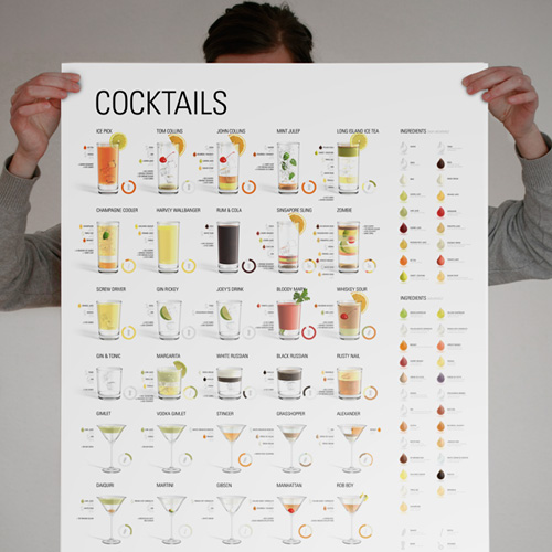 אמן גרמני בשם קונסטנטין דאץ (Konstantin Datz) אייר עבורכם לשעת הצורך פוסטר הכרחי ומאיר עיניים של כל סוגי הקוקטייל הכי שווים שיש, ולא סתם: במקום תצוגה של התוצאה והצבע הסופי – אויירה כל כוס לפי חלוקה מדויקת בשכבות צבעי מים יפות של כל מרכיבי המשקה. כך תוכלו לראות בבירור וללמוד באופן ידידותי ביותר למערבב – את הכמויות, האחוזים, שלבי ההכנה (כולל צורת כתישת הקרח הנכונה) ואפילו כוס ההגשה המתאימה ביותר. זה אומר שכל מרכיב אלכוהולי או נון-אלכוהולי קיבל מקונסטנטין צבע מיוחד ומדויק משלו, עד רמת בועות אוויר או השקיפות המתאימה (נראה אתכם יוצרים הבדל בין מים, וודקה, ג'ין, או ורמוט צרפתי). לצד כל כוס מופיע גם אייקון שירמז לכם האם את הקוקטייל הזה צריך לשקשק בשייקר, לנער בבלנדר, או לערבב עם סטירר, ויש אפילו הצעות לטאצ'אפים משדרגים שרק ברמנים מכירים (מלח, שפיץ אננס טרי או זית עם אדום כזה בפנים). שוס היסטרי.